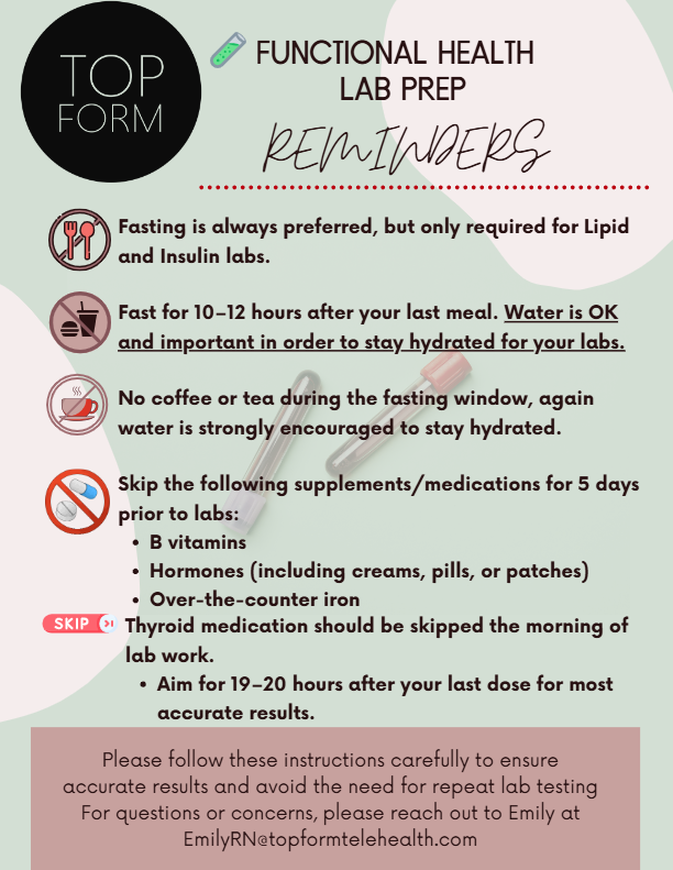 Please follow these instructions carefully to ensure accurate results and avoid the need for repeat lab testing For questions or concerns, please reach out to Emily at EmilyRN@topformcare.com