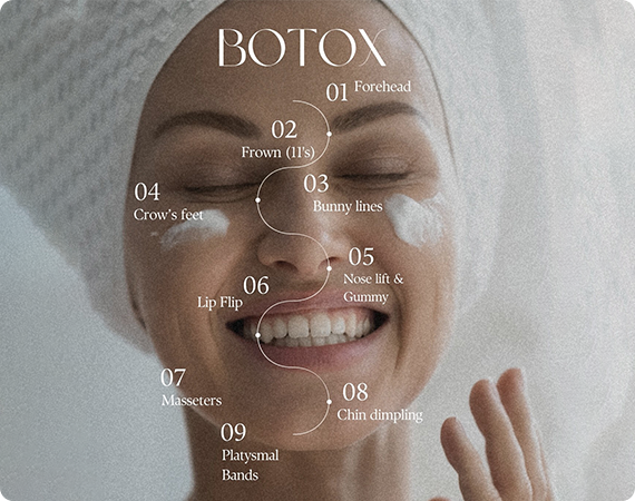 Frown lines (11’s), forehead wrinkles, crow’s feet, bunny lines, neck bands, lip flip, jaw slimming (masseter), and more